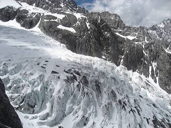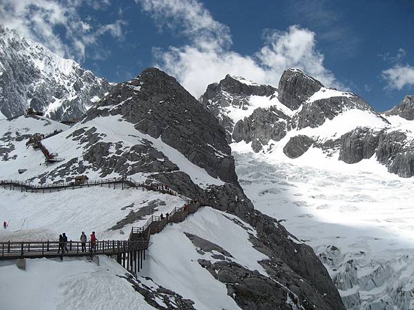 由3100米坐上冰川索道,下了覽車後就是4506的雪山頂,索道讓一般民衆不費吹灰之力,也能一睹冰川雪山的風彩,是非常便民的建設。棧道的盡頭、黑岩腳下,就是冰川遺跡