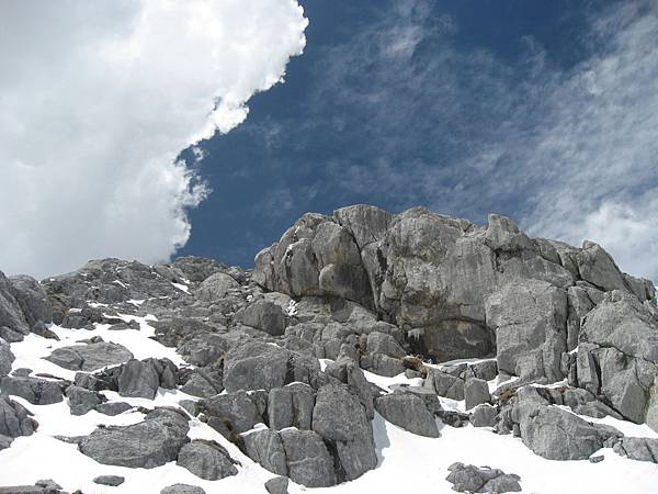 抬頭仰望,雲層似乎就停在峰頂上,雲下灰黑的亂石、雲上湛藍的天空混搭出豐富多元的景觀