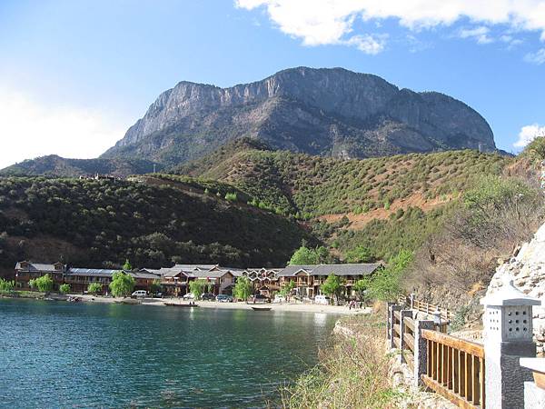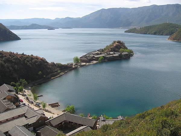 在進入瀘沽湖前的公路旁就可以一覽整個湖區景色,湖的對面是女神山及里格村,左邊是大落水村,也是最早開發的村子,住宿及吃飯也是最方便的地方,因為競爭較多,消費也比里格便宜