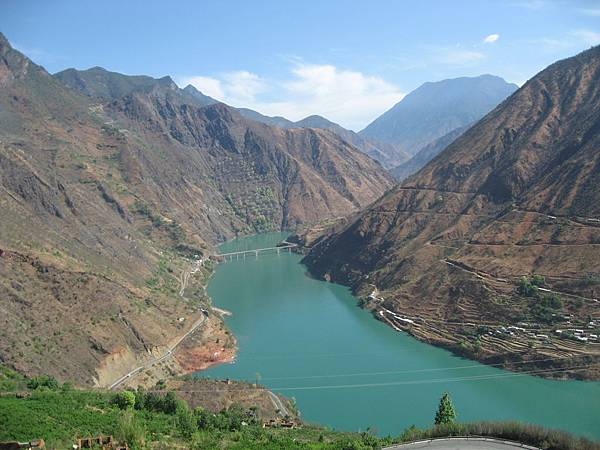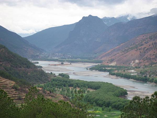 長江到了接近虎跳峽的地方,水量之多,倒像是個湖了,大水由遠方右側的山谷流出,那山谷就是金沙江流域上的虎跳峽了