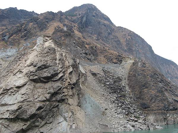從上虎跳峽景區由下往上看,皆是懸崖峭壁,高處半山腰有一條公路,再往上比較平緩的斜坡,就是我們要穿越的羊腸小道了