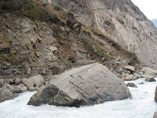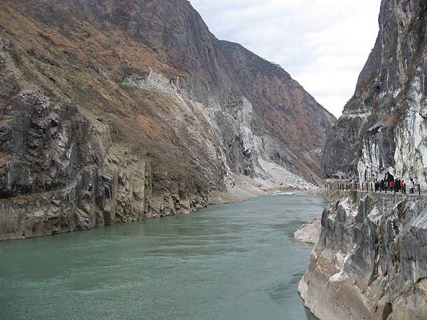 往金沙江上遊看去,右側是上虎跳景區靠近江面的步道,左側看似無路可走的陡壁上,其實有著今明兩天要走的小道。走在半山的步道上,就會發掘峽谷比想像中更深、金沙江也會變得細小如麻